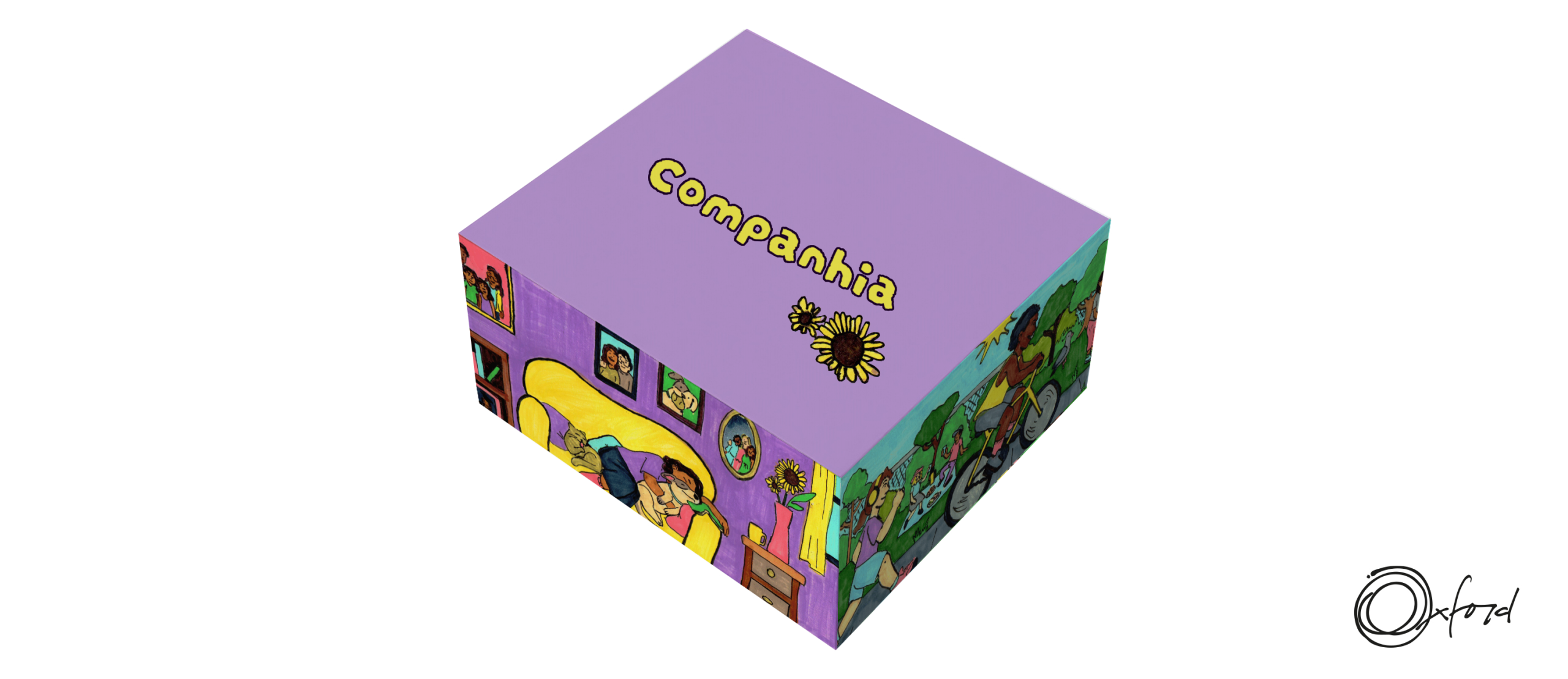 A partir da proposta “O que faz seu dia sorrir?” foram elaboradas duas cenas: uma interna, representando tranquilidade e tempo de qualidade com aqueles que amamos, e uma externa, representando movimento e dias ensolarados. Os desenhos foram feitos com canetinha e retocados digitalmente.